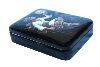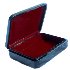The box is constructed from paper-mache. Black lacquer is used to paint the exterior of the box while red lacquer completes the interior of the work. A hinge is fastened to the left of the composition, and the box rests flat.