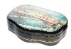 The box is constructed from paper-mache. Black lacquer is used to paint the exterior of the box while red lacquer completes the interior of the work. A hinge is fastened to the top of the composition, and the box rests on a wavy platform. The work is signed with the artist's name, 2017 and the village of Fedoskino.