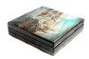 The box is made out of paper-mache. The box's exterior is black, while the interior is traditionally covered with red lacquer. The lid is hinged from the top of the scene and the box rests flat. The work is signed with the artist's name and Fedoskino.