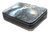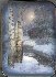 Various shades of blue oils help produce an atmosphere of a gloomy winter day. Bright silver paint highlights the trunks of the trees. A brilliant piece of mother-of-pearl shines through the trees drawn in the foreground.