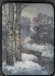 Various shades of blue oils help produce an atmosphere of a gloomy winter day. Bright silver paint highlights the trunks of the trees. A brilliant piece of mother-of-pearl shines through the trees drawn in the foreground. Silver paint and mother-of-pearl also help to enliven the monotonous color palette.