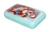 The scene painted on the lid is framed with dots and snowflackes. Glass beads are decorating the exterior bottom. The interior is traditionally covered with red lacquer, the exterior is light blue.