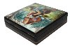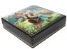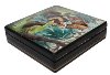 The box is constructed from paper-mache. A hinge is fastened to the top of the composition , and the box rests flat. The work is signed with Fedoskino and the artist name!