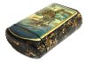 The box is constructed from paper-mache. Black lacquer is used to paint the exterior of the box while red lacquer completes the interior of the work. A hinge is fastened to the top of the scene, and the box rests on a flat bottom. The work is signed with the artist's name, Fedoskino and the year of 2006.