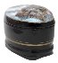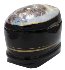 The box is constructed from paper-mache and mother-of-pearl. Black lacquer is used to paint the exterior of the piece while deep red lacquer completes the interior of the box. A hinge is fastened to the top of the composition, and the box rests on the platform, that goes around the edge of the base. The work is signed with the artist's name at the bottom of the composition.