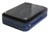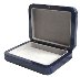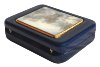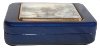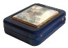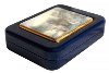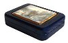 The scene is framed with a wide gold line. The box's exterior except its bottom is covered with dark blue metallic paint. Its interior is covered with the light gray velvety material.