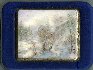 The entire scene is painted on a piece of mother-of-pearl that shines with the fire and iridescence of Australian Opal. The trees painted in the foreground shimmer brightly as they are drawn in radiant silver paints.
