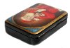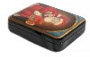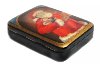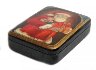 The box is constructed from paper-mache. The lid is hinged from the left of the scene, and the box rests on a flat bottom. The work is signed with the artist's name, the title "Santa" and the village of Fedoskino.
