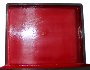 The box is constructed of paper-mache. Black lacquer covers the exterior and red lacquer covers the interior of the box. The box has a hinge from the left of the painting, and rests flat.