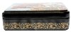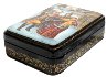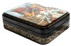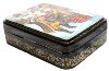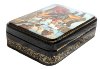 Description: This festive box is a specimen of traditional Fedoskino artistry. It features the lad playing the accordion and amusing two pretty girls and dancing lad. In old times the lad who could play the accordion was the most popular young man in the Russian village. Girls dreamt to have a date with him, lads respected him. Singing and dancing to the accompaniment of accordion was the only available amusement then. The scenes like this one, depicting peasants and craftsmen, their daily life, feasts, and traditions were very popular during the Vishnyakov and Lukutin era. The original comosition was painted by a well-known Fedoskino Master Boris Shavirin.