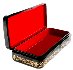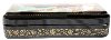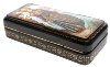 The box is constructed from paper-mache. Black lacquer is used to paint the exterior of the box while red lacquer completes the interior of the piece. The scene is framed with a floral golden ornament; more complex golden floral ornamentation wraps around the box's sides.