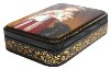 The box is made out of paper-mache. Black lacquer with silver paint covers the exterior and red lacquer covers the interior of the box. The lid is hinged from the left of the scene, and the box rests on a flat bottom. The work is signed with the artist's name, Fedoskino, and the year of 2019.