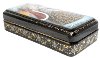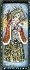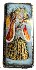 The artist demonstrates his unsurpassed skill while painting the Snowmaiden's festive attire. Painting with an ultra fine brush, she creates exquisite gold lace texture of her fur coat, stand-up collar and crown. The effect of festivity is strengthened by a piece of mother-of-pear inlaid into her costume; it shimmers beautifully with bright green and blue tints. Another piece of mother-of-pear is shining through the beautiful hat-set (cocoshnik).