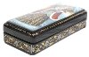 The box is constructed from paper-mache. Black lacquer is used to paint the exterior of the piece while red lacquer completes the interior of the work. The lid is hinged to the left from the composition, and the box rests flat. Signed with the artist's name, Fedoskino and the year of 2019.