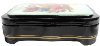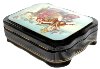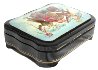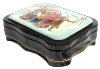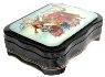 The box is constructed out of paper-mache. Black lacquer is used to paint the exterior and red lacquer is used to paint the interior of the box. The box has a hinge located above the composition and rests on the four legs. The artist has signed her name, Fedoskino and 2018 under the composition.