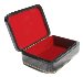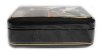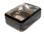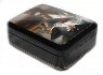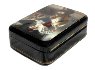 The box is constructed from paper-mache. Black lacquer is used to paint the exterior of the box while red lacquer completes the interior of the work. The lid is hinged from the left of the portrait, and the box rests on a flat bottom.