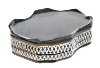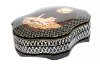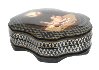 The box is constructed from paper-mache. Black lacquer is used to paint the exterior of the piece while red lacquer completes the interior of the box. The lid is hinged from the top of the composition, and the box rests on a wavy platform with several legs.The work is signed by the artist.