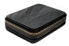 The box's exterior is covered with the black lacquer; its interior is traditionally covered with red lacquer. The box is constructed from paper-mache. The lid is hinged from the left of the scene, and the box rests on a flat bottom. Signed with the artist's name.