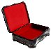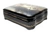 The box is constructed from paper-mache. Black lacquer is used to paint the exterior of the box while red lacquer completes the interior of the work. The box has a hinge from the top of the scene, and rests on the four legs. The work is signed by the artist.