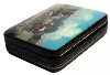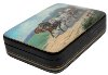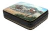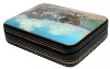 The scene is framed with a gold line while the box's sides are decorated with two parallel gold lines. A hinge is fastened to the top of the scene, and the box rests flat. The work is signed with the artist's name.