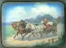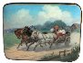 Here the artist depicts two ladies sit in a cart drawn by a troika (three) horses. On the background of the composition we can see beautiful summer landscape and the last houses at the edge of a village. The skies are blue and the clouds are white!