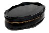 Black lacquer is used to paint the exterior of the lid and the base while red lacquer completes its interior, where there is no painting. The lid is hinged from the top of the scene, and the box rests on a wavy platform. The work is signed with the artist's name.