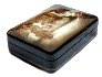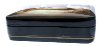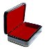 The box is constructed from paper-mache. Black lacquer is used to paint the exterior of the box while red lacquer completes the interior of the work. The lid is hinged, and the box rests flat. The work is NOT signed.