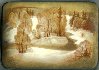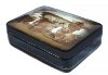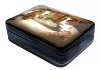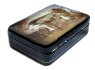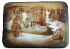 This very bright box with a winter landscape was painted in Fedoskino. The author masterfully used a mixture of bronze paint and lacquer for painting, the tops of trees and the surface of the river are painted with gold paint. The author perfectly displayed the play of shadows from trees. On the right we see two figures of skiers at the edge of the forest.