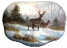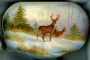 Here the artist has depicted a large male deer with horns and a female deer at the edge of the forest.The stems of grass and trees are painted out in a great detail, same as the figures of the animals.
