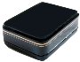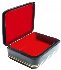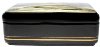 The box is constructed from paper-mache. Black lacquer is used to paint the exterior of the piece while red lacquer completes the interior of the box. A hinge is fastened to the top of the composition, and the box rests flat. The work is signed and dated (2011) at the bottom of the composition.