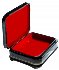 The box is constructed from pressed paper. Black lacquer covers the exterior and red lacquer covers the interior of the box.