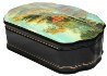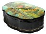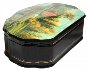 The box is constructed from paper-mache. The lid is hinged from the top of the scene, and the box rests flat. The work is signed with the artist's name, 2015 and the village of Fedoskino.