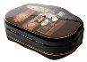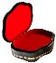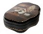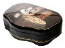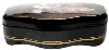 The box is constructed out of paper-mache. Black lacquer covers the exterior and red lacquer covers the interior of the box. The box has a hinge from the top of the scene, and the box rests on a wavy platform with six legs. The box is signed with the artist's name.