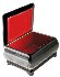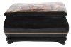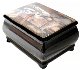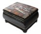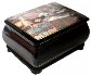 The box is constructed from paper-mache. Black lacquer is used to paint the exterior of the box while red lacquer completes the interior of the work. The lid is hinged from the left of the portrait, and the box rests on the four legs. The work is signed with the artist's name.