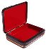 The box is constructed from paper-mache. Black lacquer is used to paint the exterior of the box while red lacquer completes the interior of the work. The lid is hinged from the left of the scene, and the box rests flat. The work is signed with the artist's name.