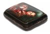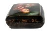 The box is made out of paper-mache. The lid is hinged from the left of the scene and the box sits flat. The work is signed with the artist's name and the village of Fedoskino.