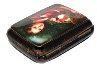 The scene is framed with a gold line. The black lacquered exterior of the box is covered with gold blurry spots to make the box look appealing. The interior is traditionally red. The Fedoskino "troika" insignia can be found on the interior of the lid.