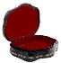 The exterior of the box is painted with black lacquer and the interior is painted with red lacquer. The lid is hinged from the top of the composition and the box rests on the six wavy legs. The box is signed with the artist's name and the year 2016.