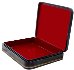 The box is constructed from paper-mache. Black lacquer is used to paint the exterior of the box while red lacquer completes the interior of the work. A hinge is fastened from the top of the scene, and the box rests on a flat bottom. The box is signed with the name of the artist.