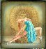 It shows a ballet dancer dressed in the color of the sea wave costume. On the background we can see bas-relief of a giant head of Italian origin...