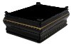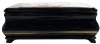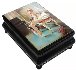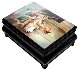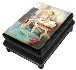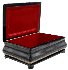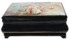 The box is constructed from paper-mache. Black lacquer is used to paint the exterior of the box while red lacquer completes the interior of the work. The painting is framed with a gold line. Two parallel gold lines are decorating the sides of the box.