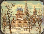 Light blue tones of oils suitable for reproduction of a winter scene dominate here. Gold paint is used to detail the architecture, and create brilliance of the trees painted in the foreground. A shinning piece of mother-of-pearl is set into each cathedral painted in the foreground (only the tall cathedral painted in far background is left without mother-of-pearl inlay).