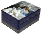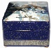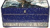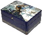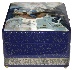 The box is constructed out of paper-mache. Blue lacquer covers the exterior and milk-white lacquer covers the interior of the box. On the front side of the box, the small golden metal ball is attached - it is the imitation of a lock. The lid is hinged at top, and the box rests on four small metal balls used as legs. The work is signed by Pavel Anokhin just under the depicted scene.