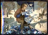 Lustrous silver paint is used to highlight the master's hair, and to paint the border behind his back, to create a sensation that it is made out of iron. Silver paint also shines through the master's apron and the wing of the mechanically bird lying on the table. Gold paint is used to create the effect of a burning bulb of the lamp painted just over the master's head.