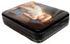 The box is constructed from paper-mache. Black lacquer is used to paint the exterior of the box while red lacquer completes the interior of the work. The lid is hinged from the left of the scene, and the box rests on four legs. The work is signed with the artist's name.