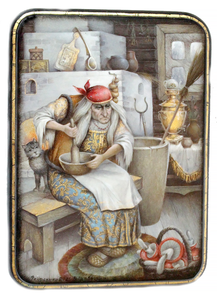 Baba Yaga is the oldest character of the Slavonic mythology. Originally Baba Yaga was the goddess of death; people imagined her as a woman with the snake tail who guarded the entrance into the other world and accompanied the souls of dead people into the Kingdom of the Dead. Baba-Yaga is the most famous figure in Russian fairy-tales that represents evil. It is a character of such fairy-tales as "Marya Morevna", "Princess Frog", "The Tale of Life Water and Youth Giving Apples", and many, many others.