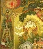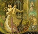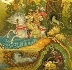 Alluring pastels blend within a rainbow of exquisite colors and precise detailing. Olive greens, light tan, caramel, orange and blue make up the majority of the beautiful setting. The oak's crown, the sun painted in the left upper corner and the cathedrals of the kingdom are painted against the lustrous gold background. Gold is also abundantly used to detail and paint various elements throughout the composition including Ruslan's armour, Koshchey's treasures, light in the windows and many others.