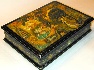 The box is constructed from paper-mache made in the village of Mstera. Black lacquer is used to paint the exterior of the piece while red lacquer completes the interior of the box. A hinge has been fastened along the top of the composition and the box rests on four legs. The work is signed and titled by the author.