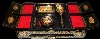 Each of the lids on the four outer compartments are hinged to their outermost side. The central lid is hinged at the top of the composition and a brace, which holds the lid upright upon opening, is added as well. Each of the interior pieces is a feast for the eyes and mind. The application of gold is used as brightly as the element allows. Shimmering, glowing, reflective. Composed pirate's treasure. The piece depicting the Queen is especially inspiring, with its navy blue background and deep red roses.