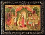 The full story of "The Dead Tsarina and the Seven Bogatyrs" can be found in the popular Lucy Maxym book entitled, Russian Lacquer, Legends and Fairy Tales Volume II. On the center and largest composition, painted on the lid of the vanity mirror, we see the beautiful Princess as she meets the Seven Bogatyrs for the very first time. The Bogatyrs request that she select one of them as her husband while the others will remain as her sworn brothers. She neglects, telling them that she has sincere love for Prince Elisey. In a bit of foreshadowing, we see Prince Elisey on horseback towards the upper left portion of this composition. He asks the Wind, who eventually helps him, if he has seen where his beloved could possibly be. The barkedy dog of the Princess can also be seen here as well.